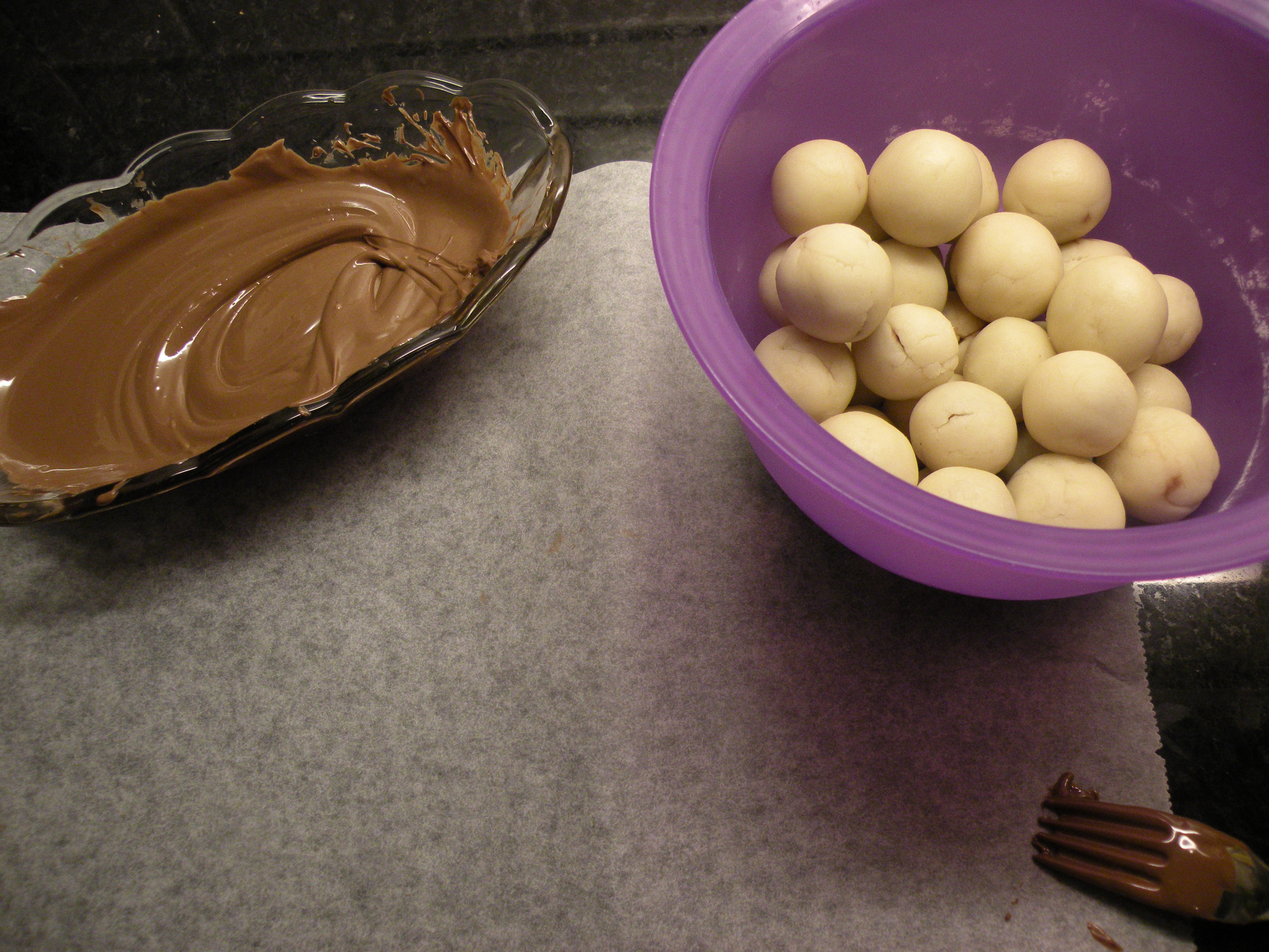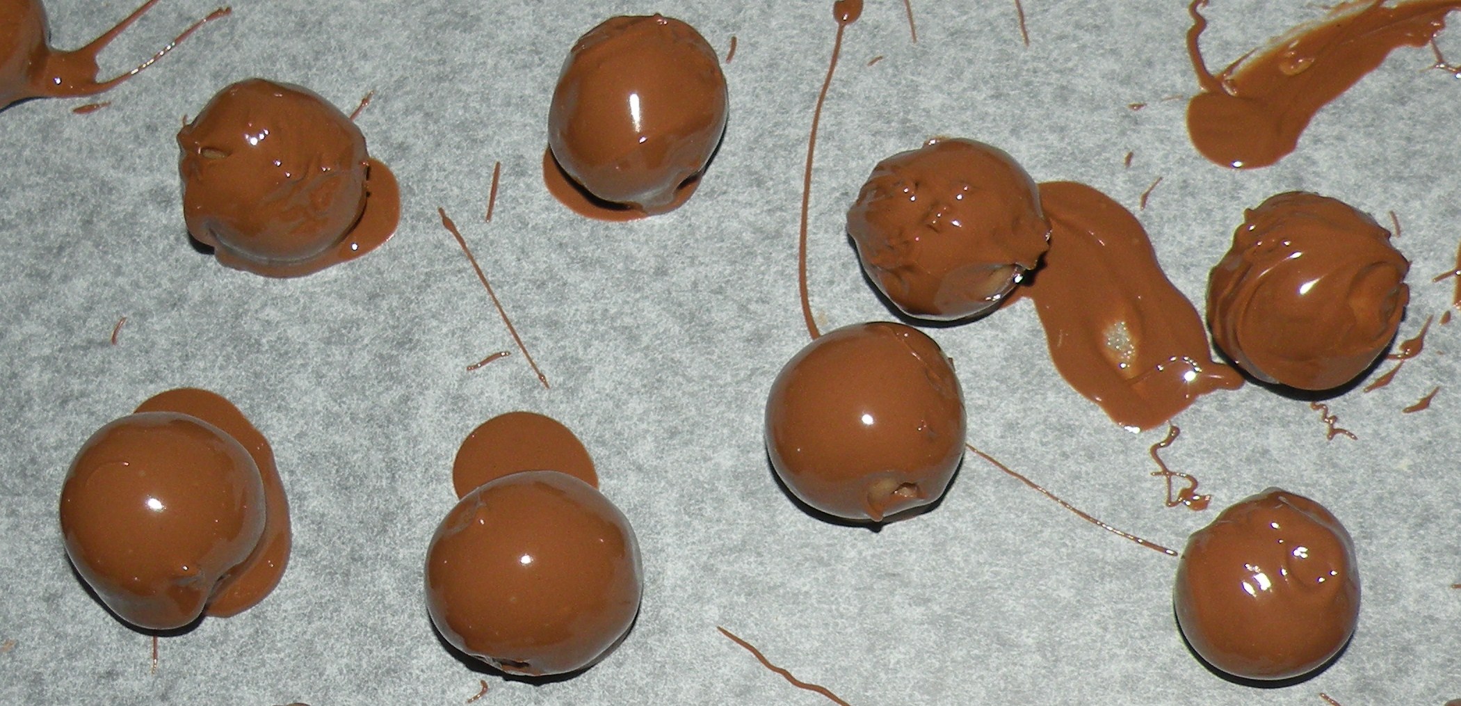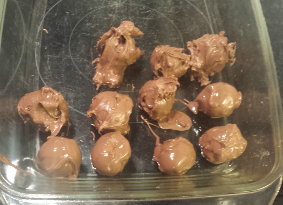 Mitt tålamod var inte riktigt kompatibelt med den metoden så jag prövade en annan väg. Släng ner ett gäng kulor i chokladen och rör om försiktigt innan du lägger dem på bakplåtspappret. Sätt dem sedan på ett svalt ställe så de stelnar.