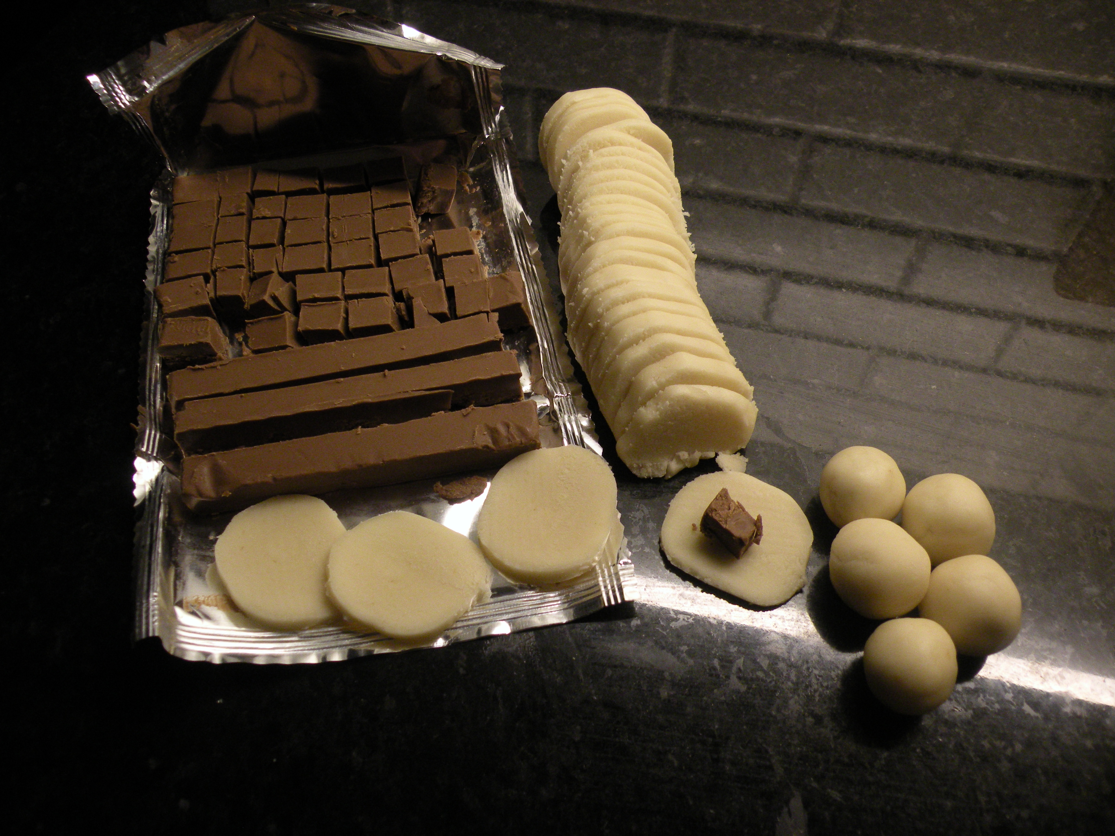 Skär nougaten i små kuber, skiva mandelmassan och/eller marsipanen. Lägg nougatkuben på mandelmasseskivan och forma mandelmassan runt nougaten till en fin kula.
