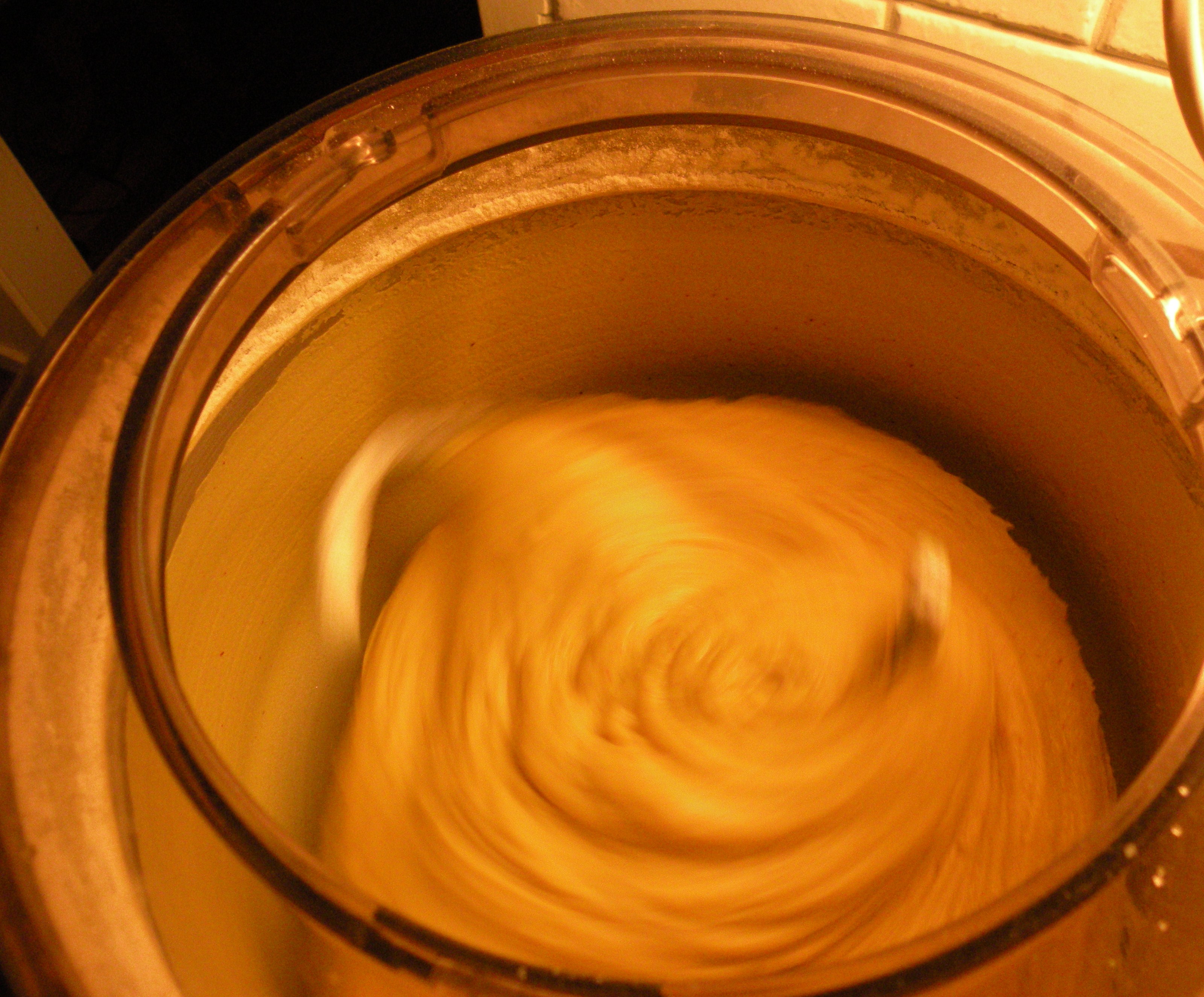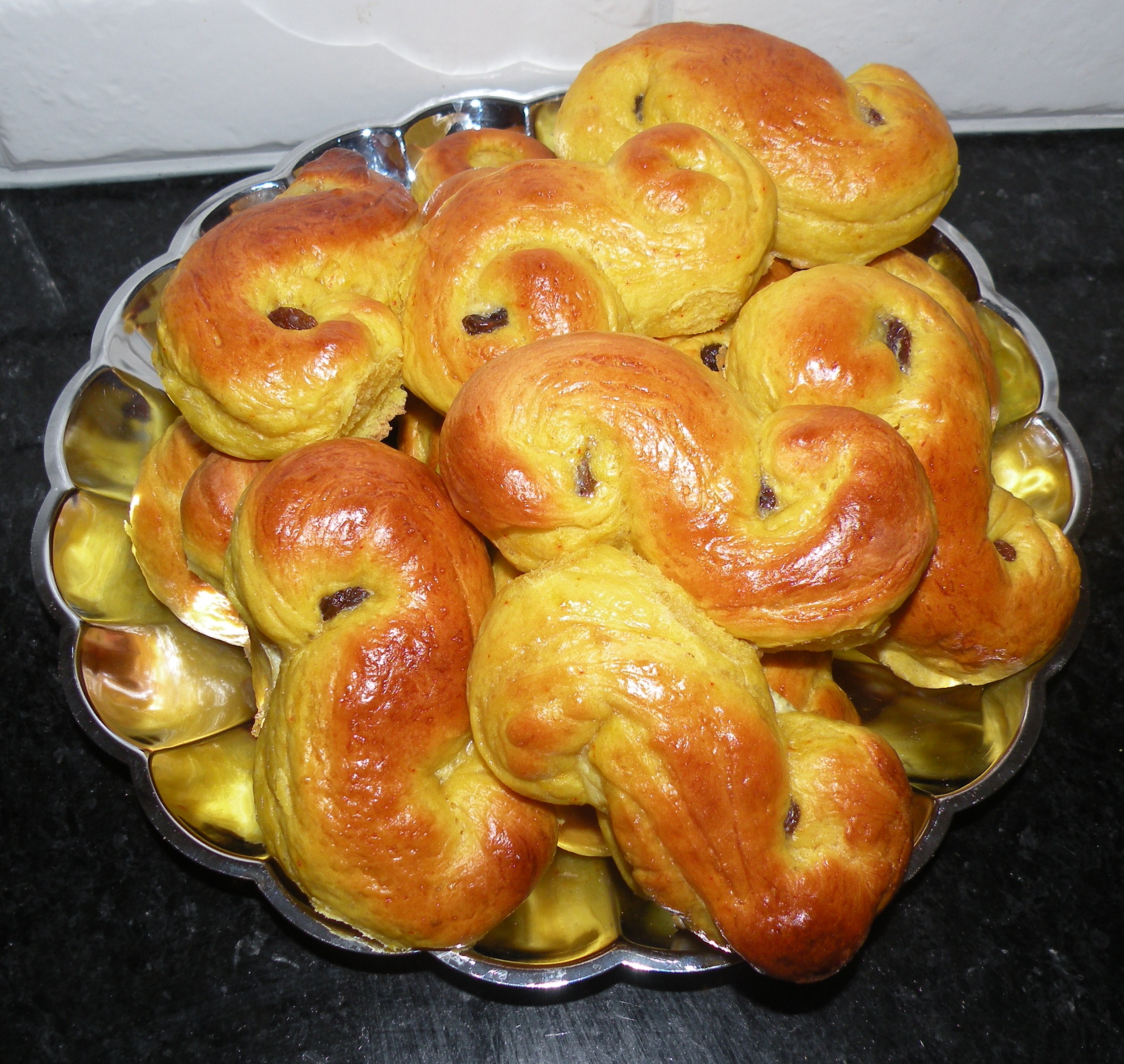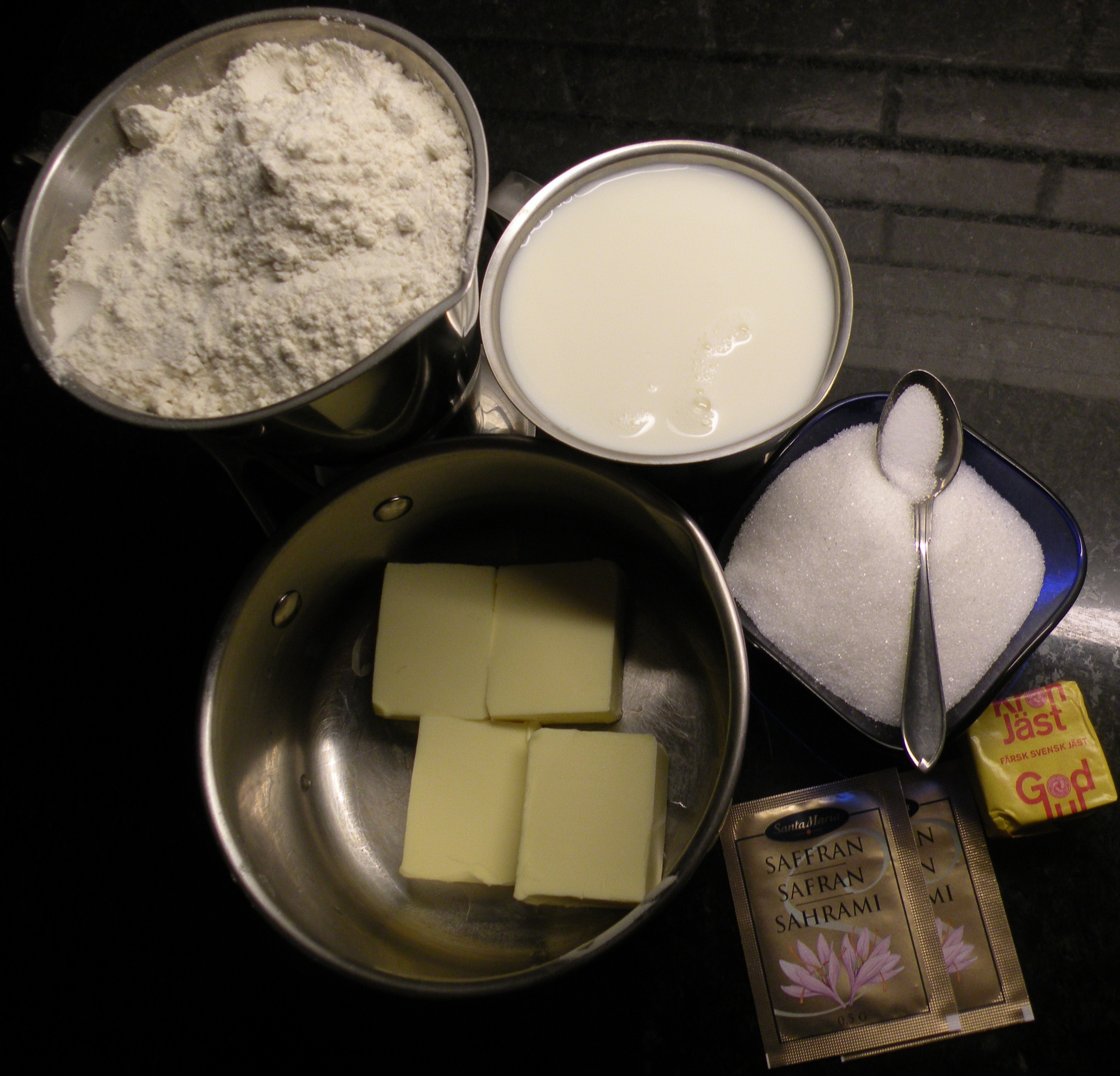 Smula jästen i en bunke eller gärna i en degberedare om du vill slippa att ”förhand”-arbeta degen så mycket. Smält smöret, tillsätt mjölken och temperera till fingervarmt, cirka 37 grader, häll degspadet över jästen och rör tills den smälter, låt saffran, socker och salt rulla med i arbetandet av degen. Tillsätt mjölet lite i taget men spara lite till utbakandet av degen.