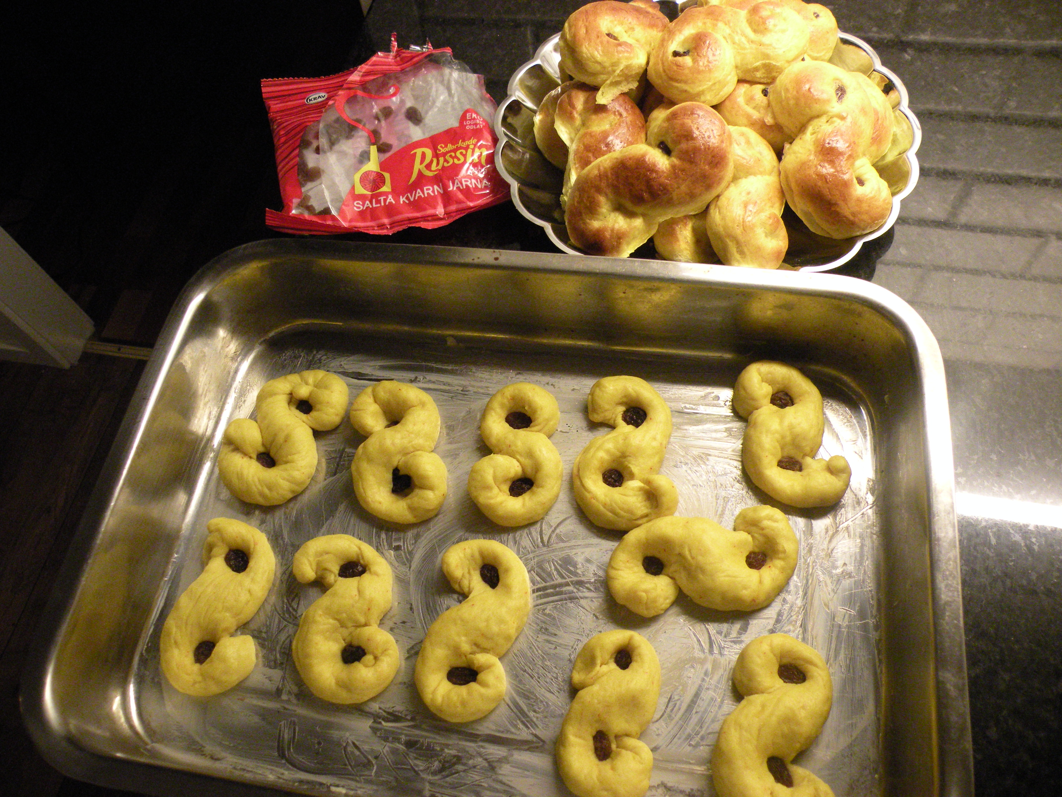 Låt degen jäsa under bakduk i en timma. Baka ut den/ forma den och lägg den på bakplåtspappersklädda plåtar. Låt jäsa under handduk i cirka en halvtimma och tryck sedan i russin i krokarna. Pensla med ett lätt uppvispat ägg och baka i ugn i 225 grader i tio minuter.