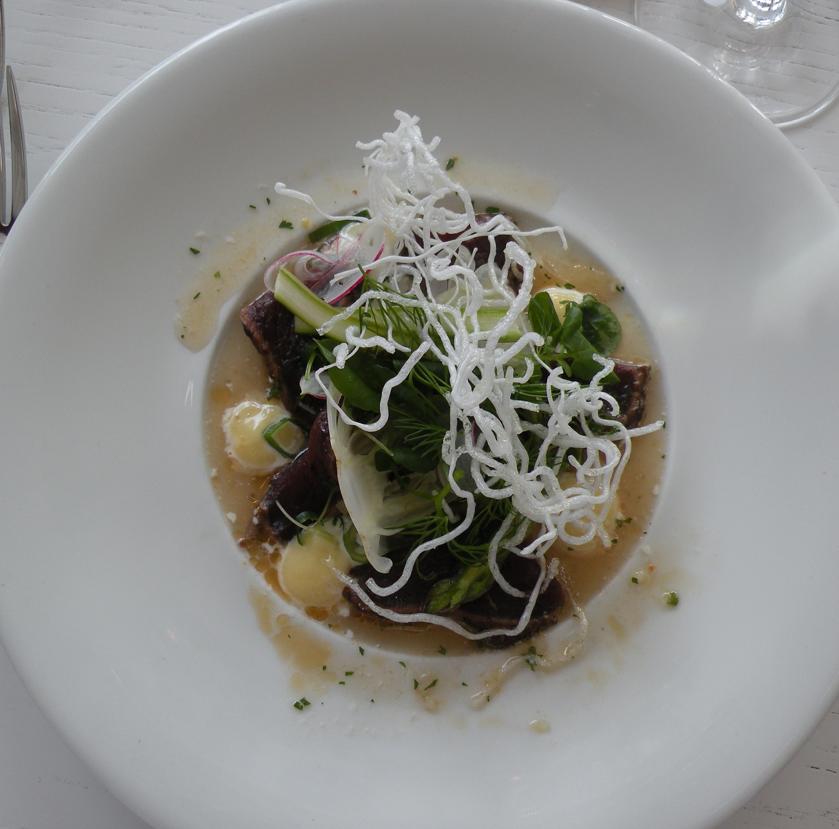 Fantastiskt! Torsken var helt fenomenal och skivade sig sådär perfekt när man rörde vid den med kniven. Den lilla purén var så len och mild och till den frasiga, friterade smakrika fläskläggen så blev det återigen ett skönt smakmöte. Lägg till pepparroten på toppen så höjdes allt ytterligare ett snäpp. Helt ljuvligt, vi var lyriska! Jag undrade lite vilka rotfrukter Gustav Trägårdh hade använt i den härliga purén så efter lunchen fick jag byta några ord med honom och fick då veta att den bestod av palsternacka, morot och jordärtskocka! Den var oförglömlig!