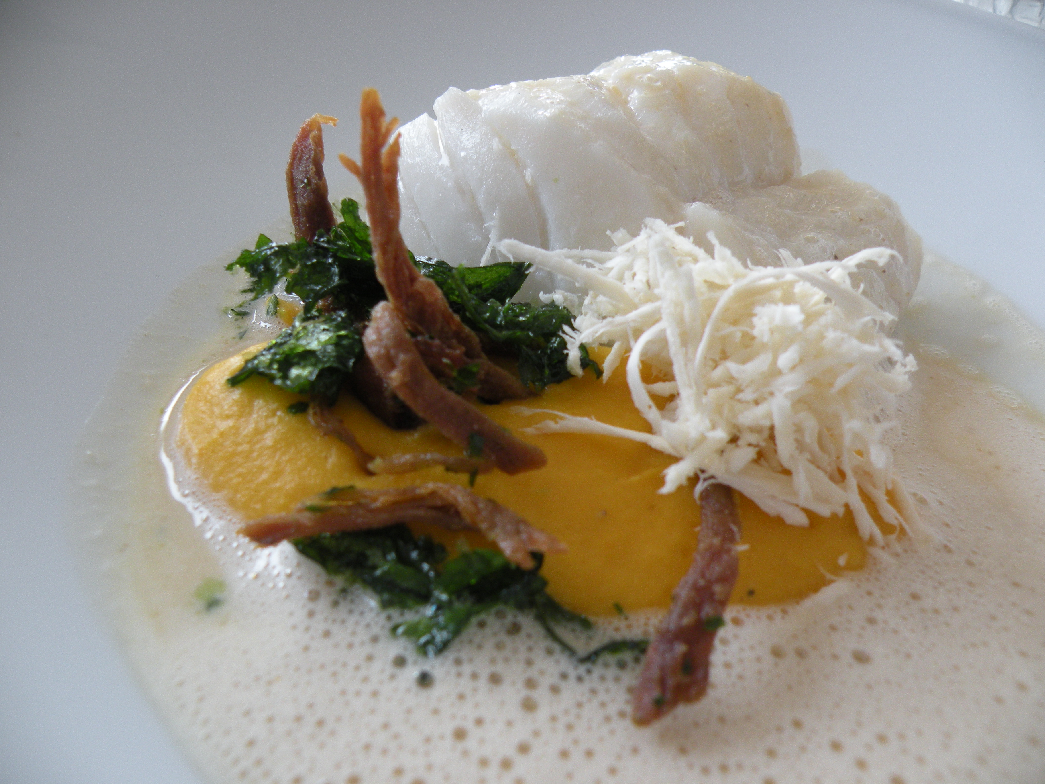 Så var det dags för huvudrätten och nu pratar vi ju Gustav Trägårdh, Göteborg och Sjömagasinet så självklart blev det torskrygg! Ångkokt torskrygg med rotfruktspuré, skummad fläskbuljong samt riven pepparrot och friterad fläsklägg från Årnäs. Till maten serverades vinet Carl Jan Vit Bordeaux 2011 Grave Frankrike som är ett medelfylligt vin med lite äppelfruktighet och frisk eftersmak.