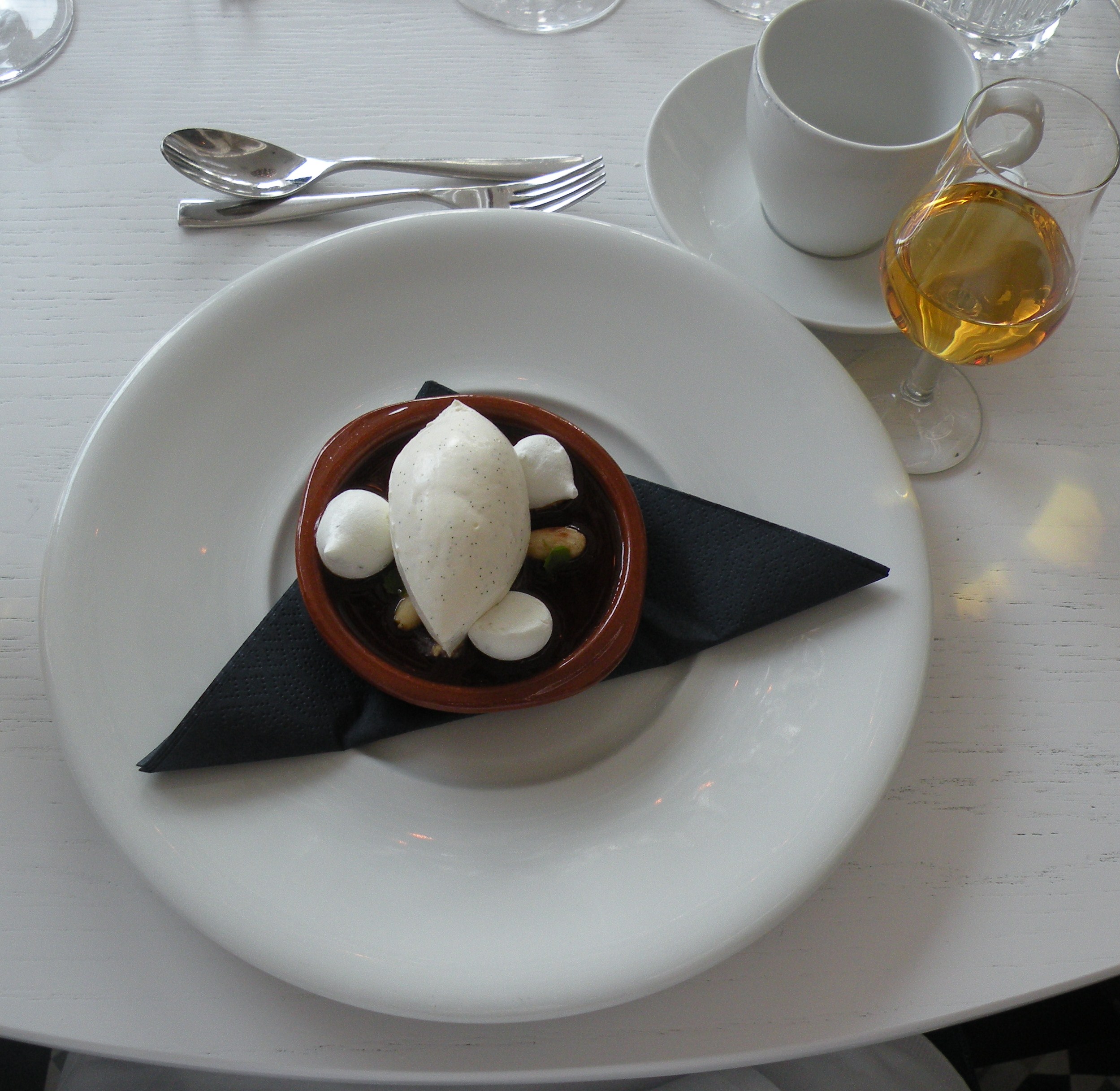 Nu var det dags att invänta nästa rätt och därmed avslutningen av dagens härliga långlunch på Varbergs vackra och trevliga Stadshotell. På menyn stod det Bakad mjölkchokladcrème med havtornscaramel, rosmarinmaräng, lättvispad vaniljgrädde och saltrostad mandel. Till detta fick vi in gott kaffe och ett friskt och mjukt dessertvin med god smak och vacker färg. Brumaire Novembre 2009 från Frankrike.
