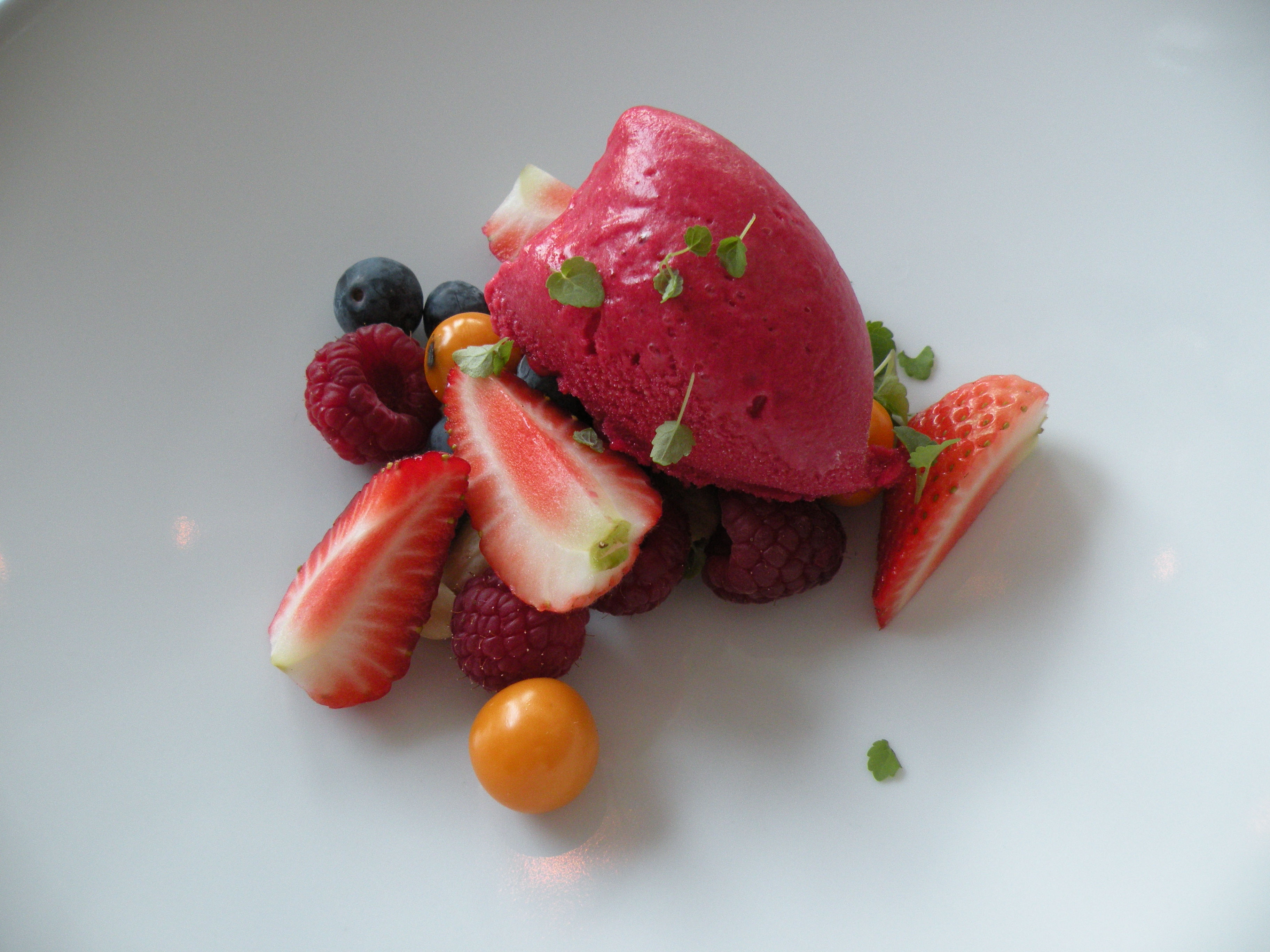Det låg små, små gröna blad på desserten och jag kunde inte lista ut vad det var. Vi som satt runt bordet kände att de hade en tydlig smak av lakrits med en friskhet och sötma, men längre kom vi inte. Jag frågade Gustav Trägårdh vad det var och han berättade att det var lakritskrasse/ Atsinakrasse! Det hade jag aldrig hört talas om tidigare så det var en ny och rolig bekantskap! Alltid får man lära sig något nytt. Min bordsgranne hade beställt ett mjölkfritt alternativ och hon fick in den här fräscha anrättningen, en bärsorbet men färska bär.