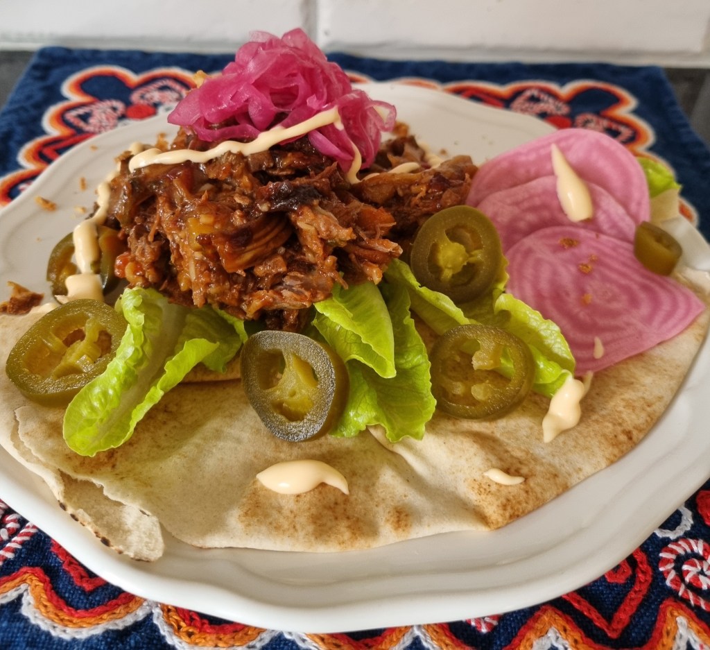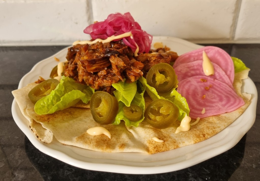På fotot här har vi libabröd, sallad, picklad rödlök, picklad polkabeta, skivade gröna jalapenos och en sriraccamajonnäs. Om man inte vill göra sås själv så finns det många goda färdiga såser att köpa, bland annat på pipflaskor så det är lätt att ringla över.