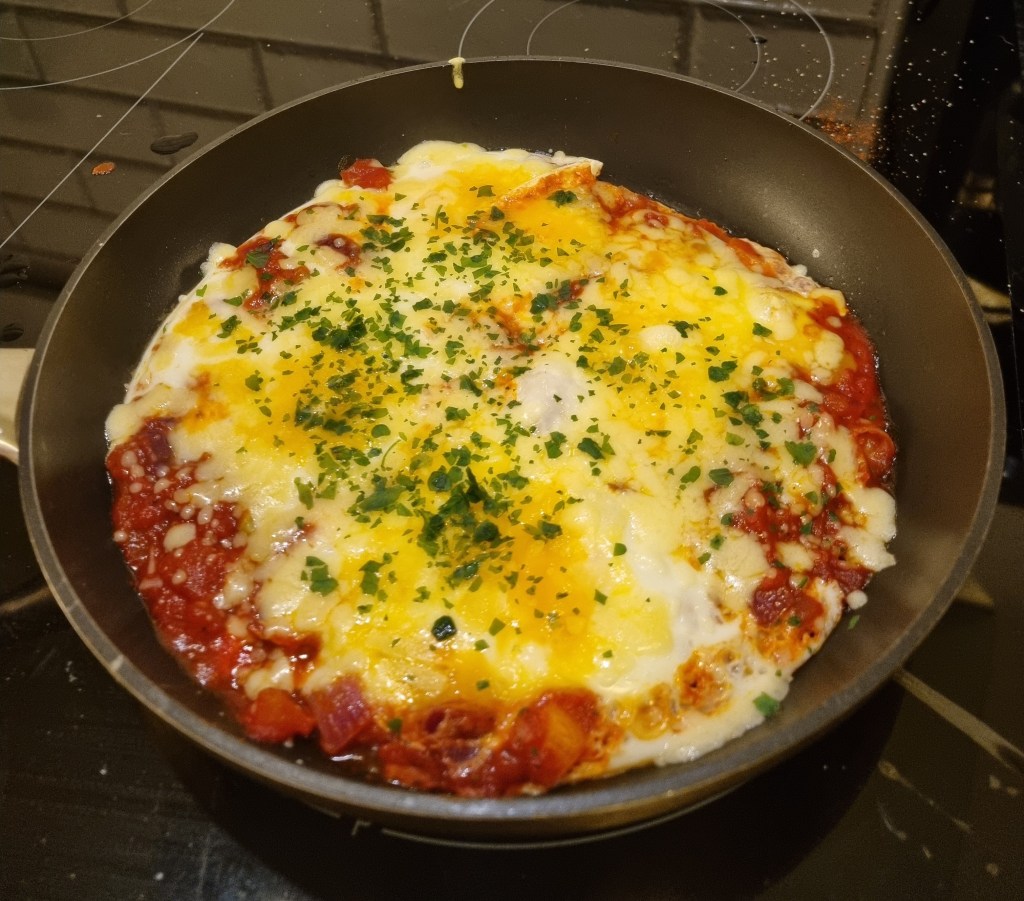 8. Strö över osten och lägg på ett lock. Låt äggen puttra i tomatsåsen tills de är så pass tillagade som du vill ha dem