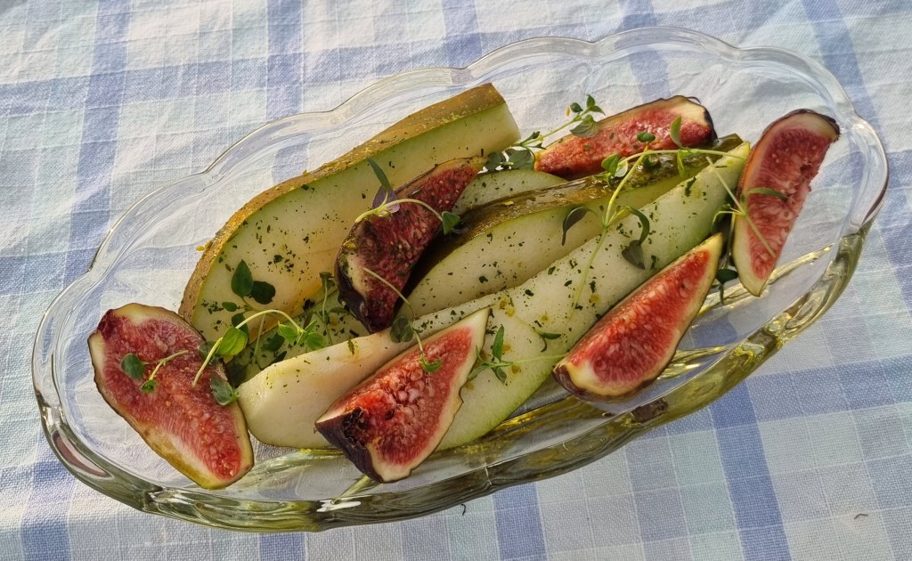 2. Dela fikonen på längden och lägg upp päron och fikon på en tallrik