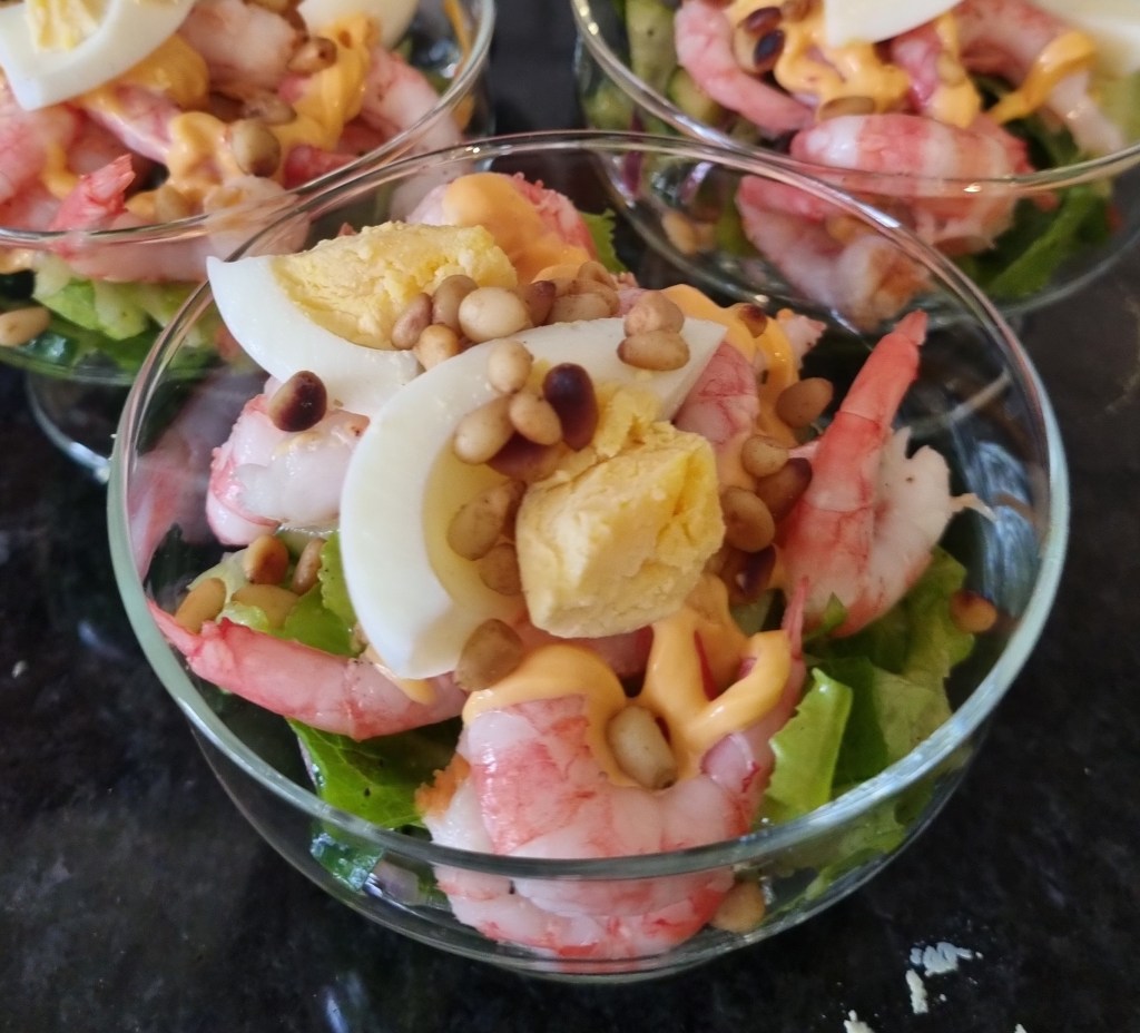 • På det räkor, äggklyftor och torrostade pinjenötter.
