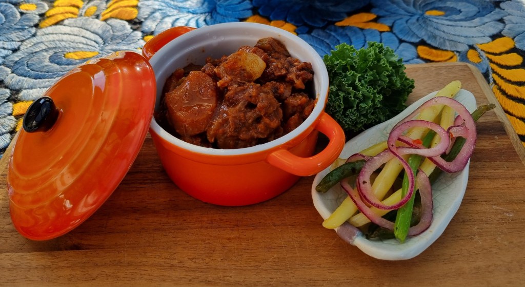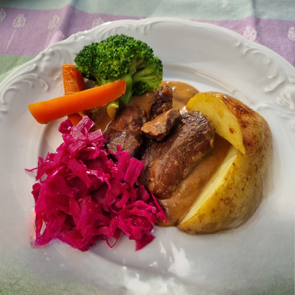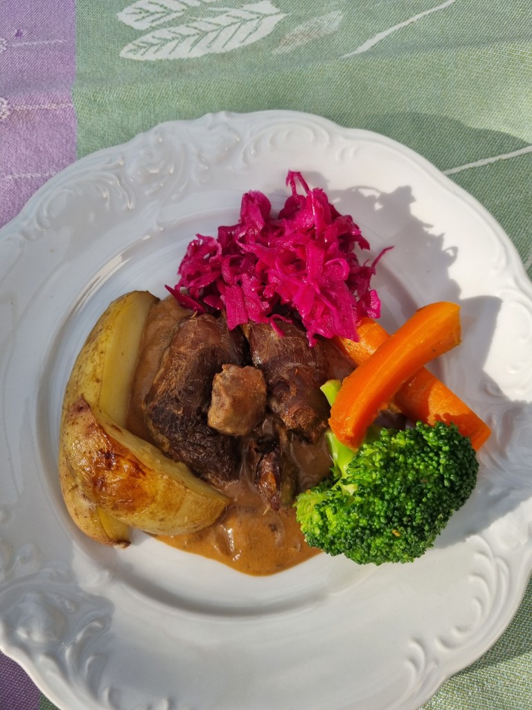 Jag serverade grytan med potatis, kokta grönsaker, picklad rödkål och lingonsylt såklart!